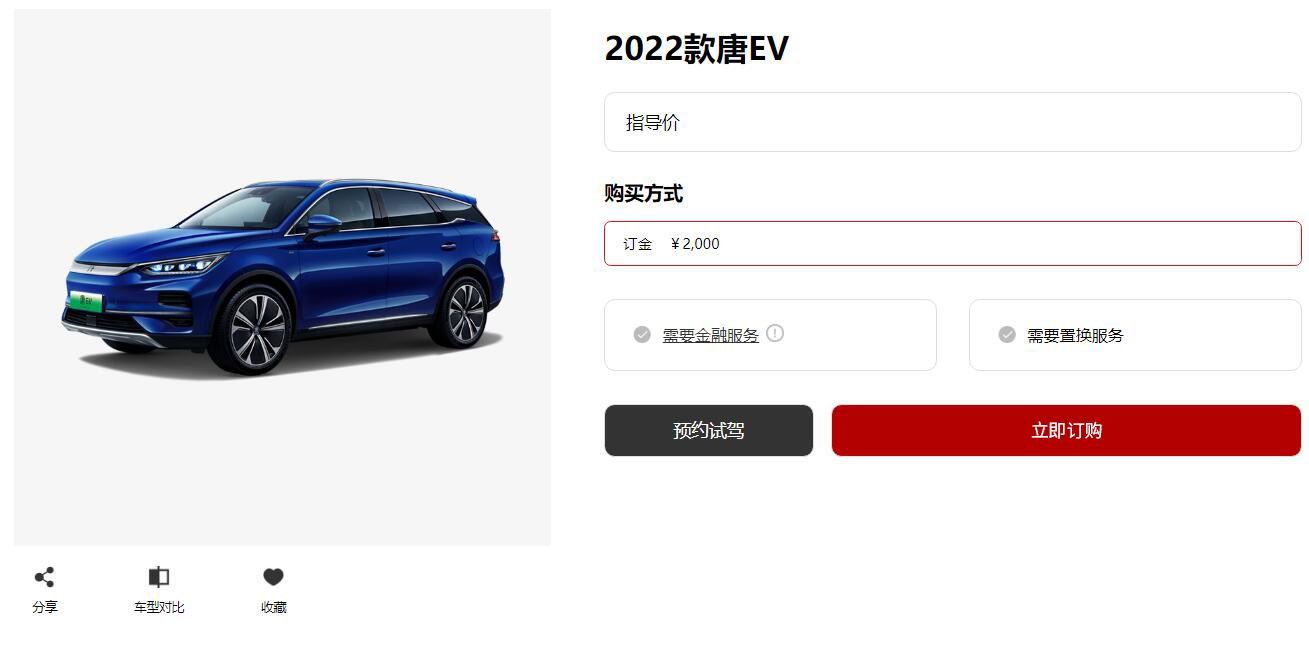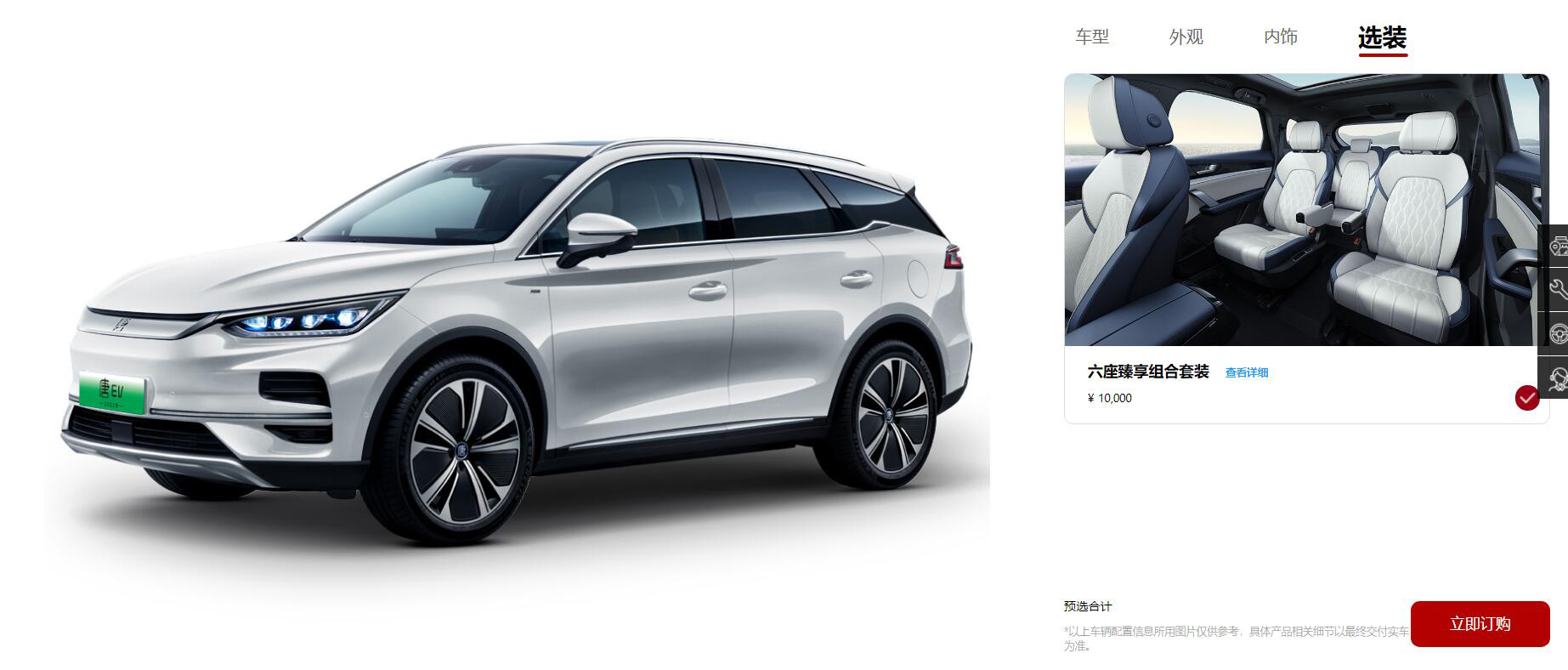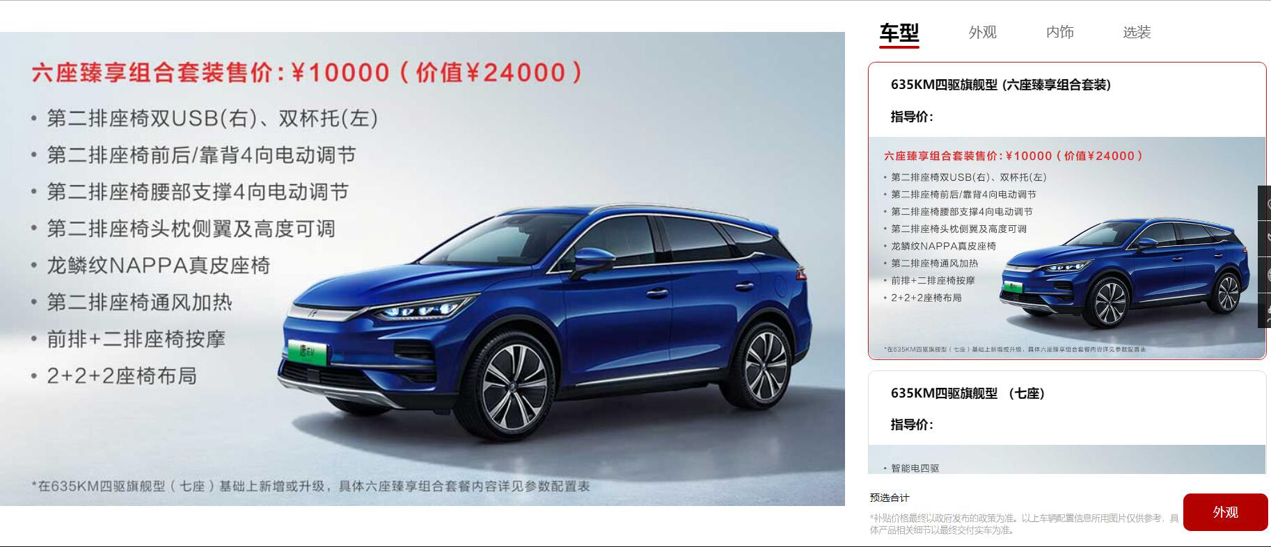 可通过选配页面对车型、外观、内饰、选装进行选配及查询。