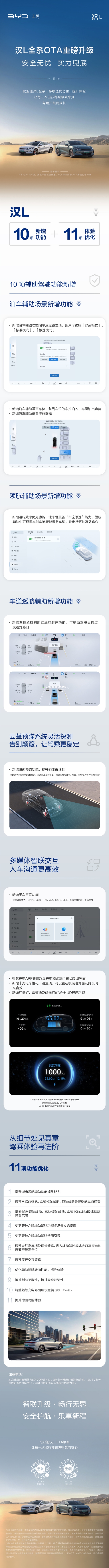 比亚迪汉L迎来全系OTA重磅升级,此次升级新增10项功能,优化11项体验 ,为车主带来全方位体验提升。